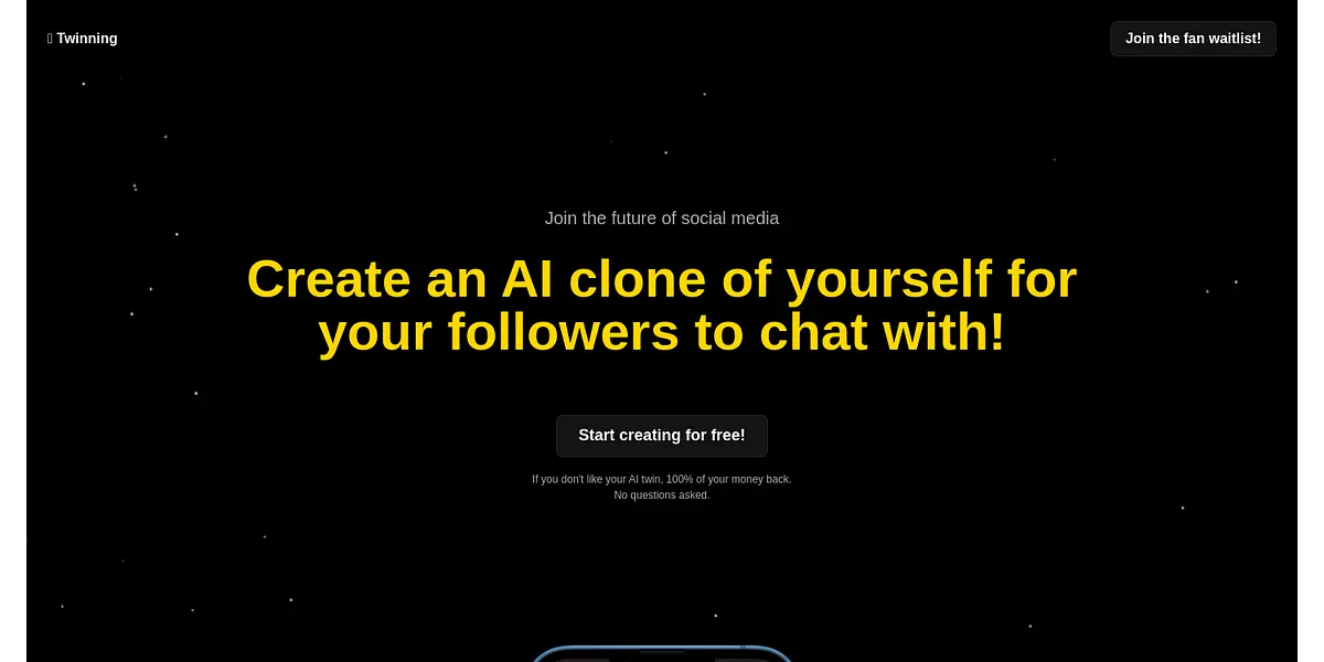 Twinning offers an innovative social media experience where you can create an AI clone of yourself to interact with your followers. Join the fan waitlist now and start creating for free! With the option to earn money every time your AI twin interacts with your followers, you can take the next step towards social media stardom.