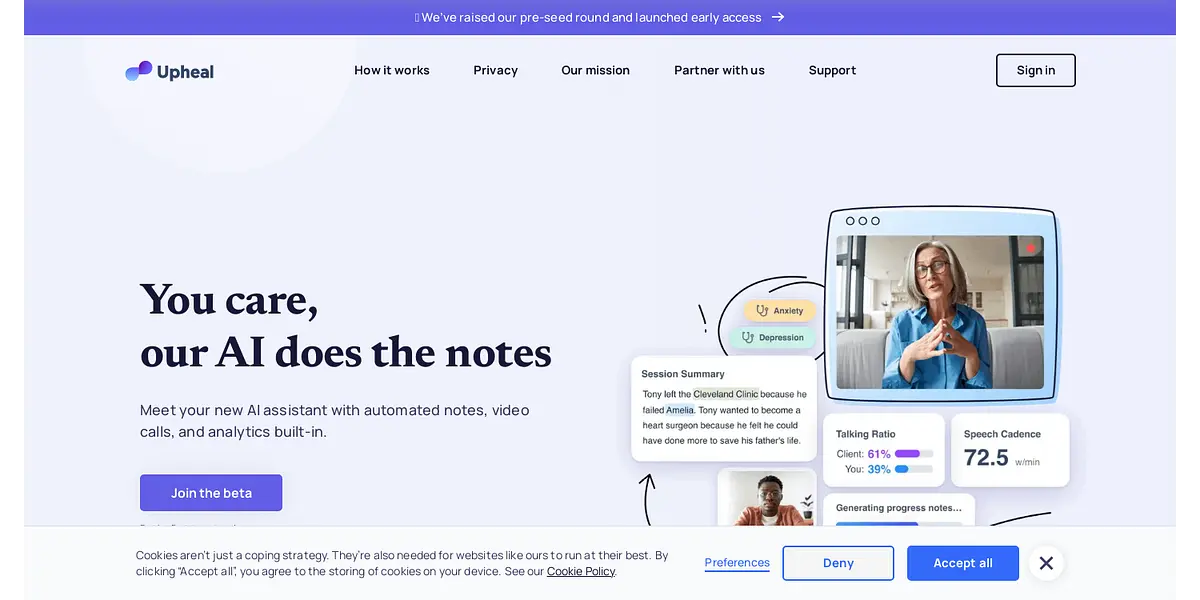 Upheal is an innovative mental health platform that offers an AI-powered solution to note-taking and analysis during therapy sessions. Co-created with experienced mental health professionals, Upheal helps therapists and coaches capture important client information quickly and easily, so they can focus on supporting their clients.