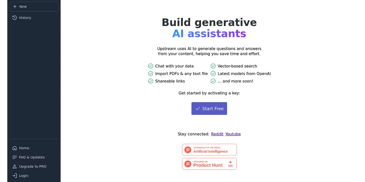 Upstream uses AI to generate Q&A from your content, saving you time and effort. Start for free and chat with your data, search with vectors, and import PDFs and text files.
