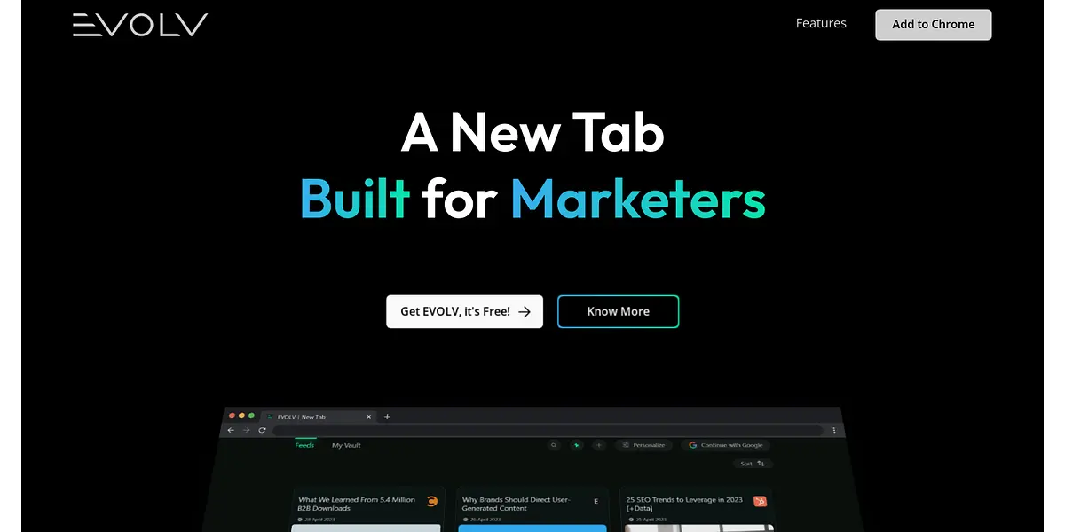 "EVOLV - Your ultimate marketing companion. Get the best of marketing updates right on your new tab page for free. AI-powered feeds that are hyper-personalized based on your expertise and proficiency to help you stay updated with what's new and relevant."