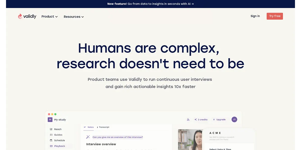Validly helps product teams run efficient and continuous user interviews to gain rich insights 10x faster. With automated recruitment and scheduling, AI-powered call transcript analysis, and instant playback and insights, Validly streamlines the research process and empowers teams to build delightful products that meet user needs. Join 140+ product teams with early access and try it for free.