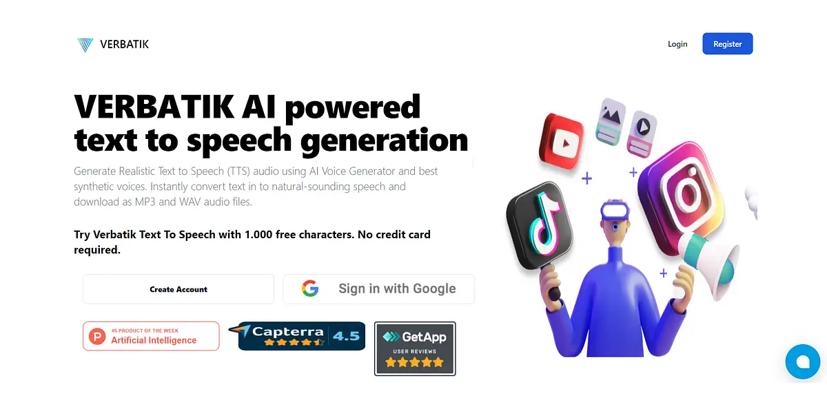 Generate Realistic Text to Speech (TTS) audio using AI Voice Generator and best synthetic voices. Instantly convert text in to natural-sounding speech and download as MP3 and WAV audio files. Try Verbatik Text To Speech with 1.000 free characters. No credit card required.