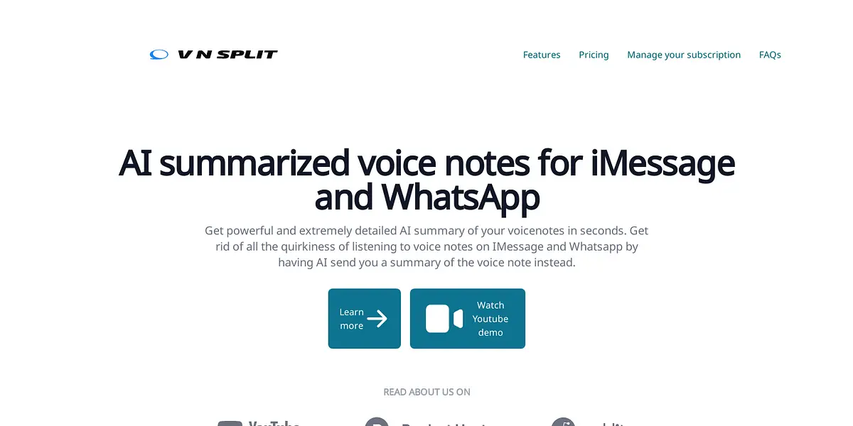 "Get rid of the hassle of listening to lengthy voice notes on IMessage and Whatsapp with AI Summarized Voice Notes. Simply subscribe to any plan,forward the message to the provided number and have extremely detailed and accurate summaries of your voice notes delivered in seconds. With support for over 50 languages and lightning-fast results,revolutionize the way you manage your voice notes today!"