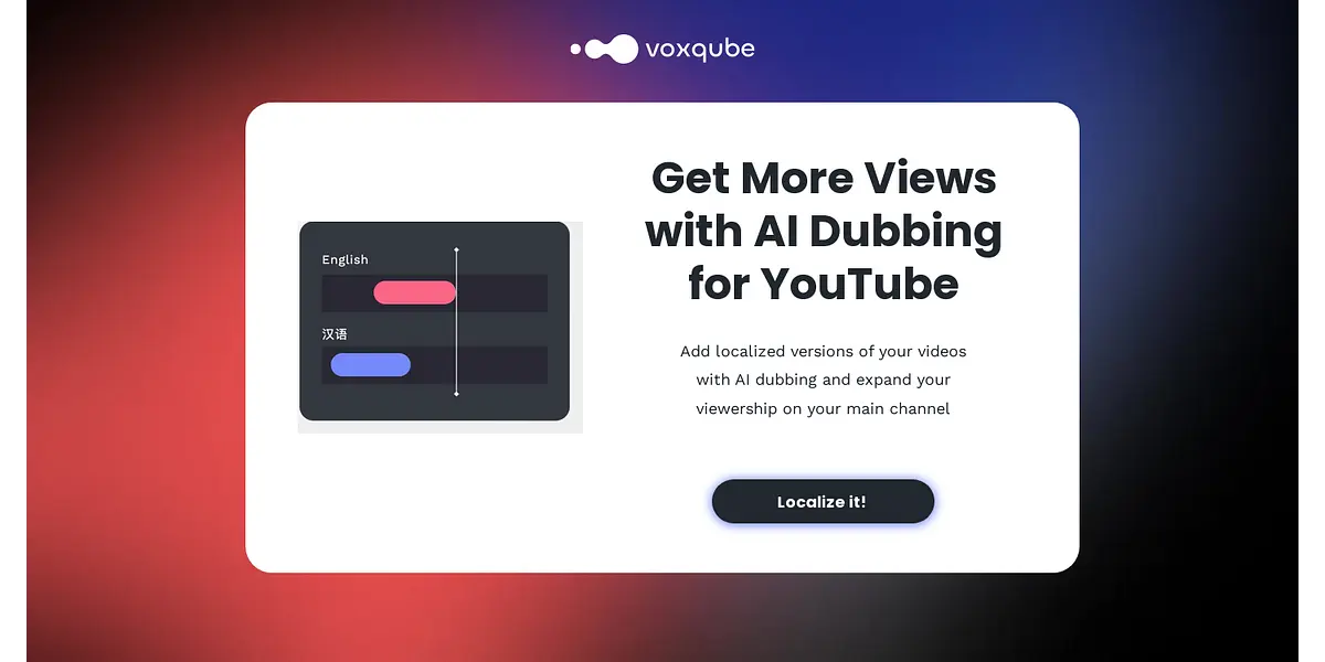 Localize and expand your reach on YouTube with AI-powered dubbing services by Voxqube. Get more views, likes, and subscribers while integrating with global brands and maximizing ad revenue. Let Voxqube handle every step of the video localization process and unlock the power of video localization for your business.