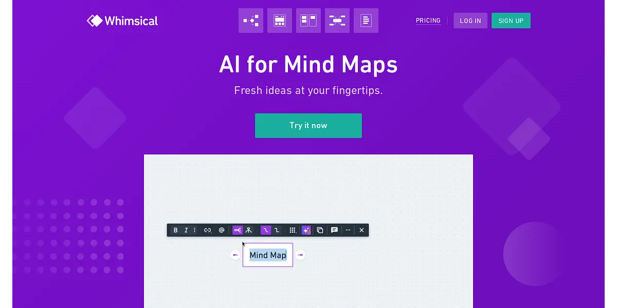 Whimsical's AI-powered mind mapping tool offers fresh ideas at your fingertips, helping you overcome brainstorming blocks and ideate faster than ever before. With flowcharts, wireframes, projects, and templates, you can level-up your workflow and create mind maps that inspire.
