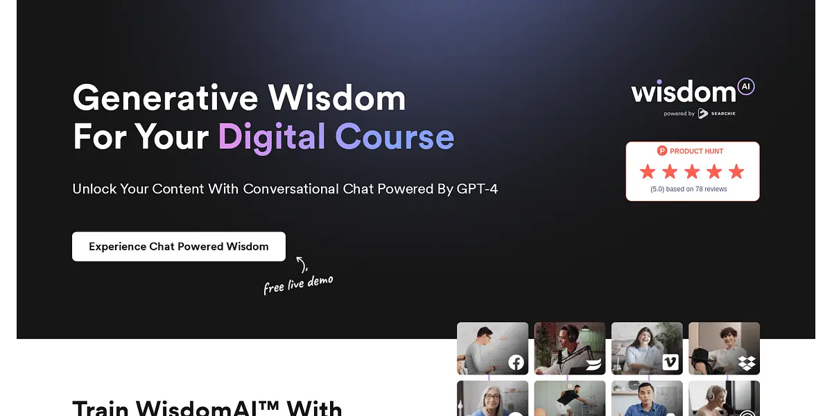 WisdomAI™ is the perfect solution for content creators looking to leverage their courses and help their audience make more progress. With the power of GPT-4, WisdomAI™ allows you to unlock your content by uploading it directly or connecting to media sources like podcasts, YouTube, or Facebook. This Artificial Intelligence technology uses machine learning to continuously learn and become even smarter with each content addition.