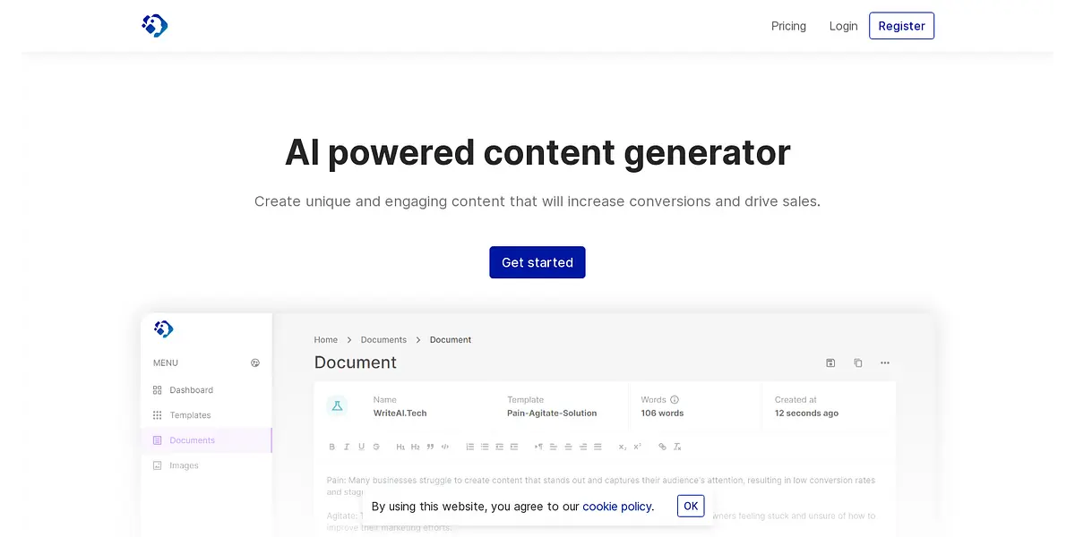 WriteAI offers AI-powered content tools to streamline content creation and increase conversions. Choose from over 40 templates and create quality content in seconds. Unlock limitless creativity with our custom templates and data export API. Try it for free or choose a pricing plan that fits your budget.