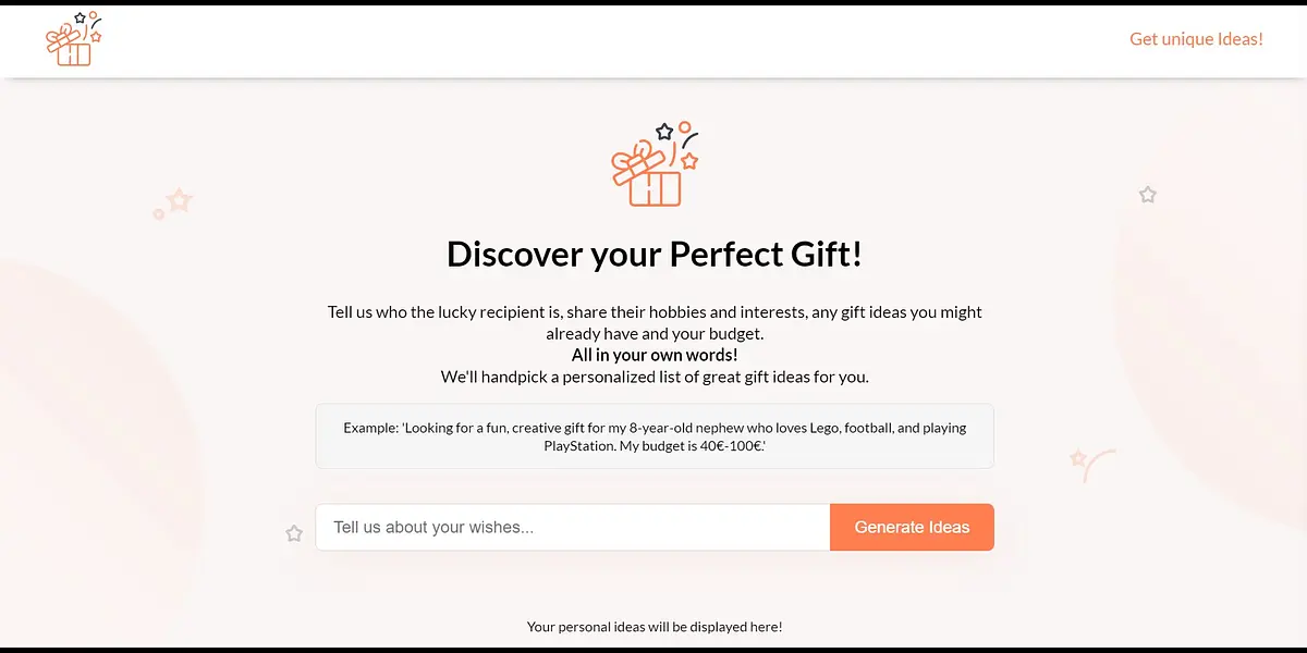 Unleash your gift-giving creativity with our personalized ideas! Simply share details on the recipient, their interests, and your budget, and we'll handpick unique gift ideas for you. Get started today and surprise your loved ones with the perfect gift.