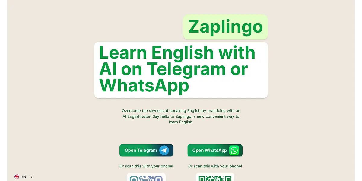 Practice speaking English with an AI tutor on Zaplingo. Improve your pronunciation, engage in real-life conversations, and receive clear grammar explanations. All on Telegram or WhatsApp, anytime you want, for free.