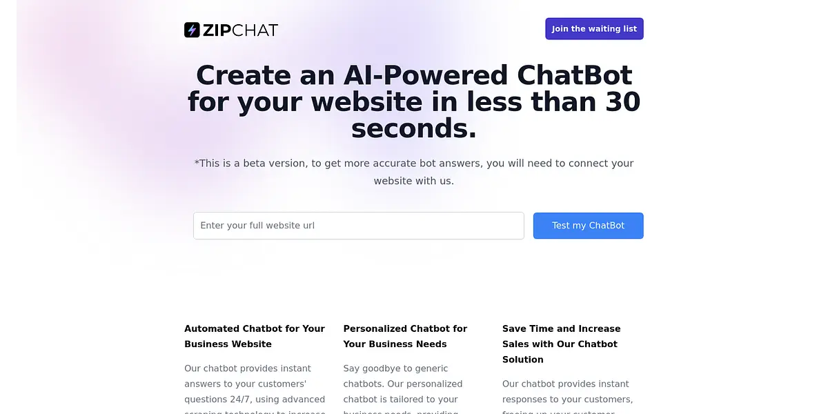 Create an AI-powered chatbot for your website within 30 seconds! ZipChat provides an automated chatbot for your business website that provides instant answers to your customers' questions 24/7, using advanced scraping technology. Its personalized chatbot is tailored to your business needs, providing unique and personalized responses to your customers.